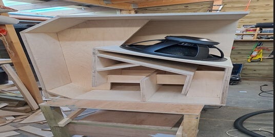 Na lang zoeken kwam ik op de TH18 subwoofer uit die de basis moest gaan vormen van het systeem. Echter bleken de berken-multiplex platen moeilijk te krijgen en ook erg groot om zelf te zagen in mijn schuurtje. Maar na goed zoeken het juiste hout gevonden en tevens mijn schuur vergroot zodat er ruimte was om te zagen.