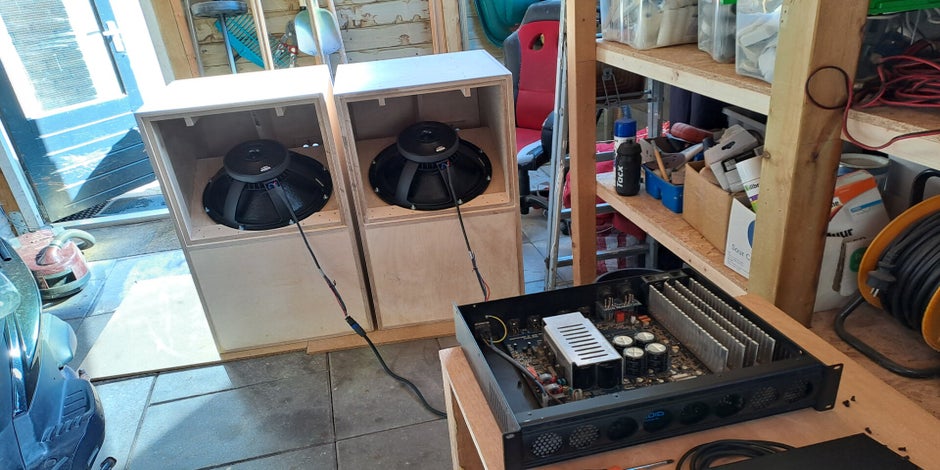 Na een half jaar bouwen waren de subwoofers klaar om te testen. In m'n eigen schuur testen bleek niet erg handig aangezien al het gereedschap en bakjes met schroeven van zijn plaats trilden. Uiteindelijk een dagje mogen testen in de grote zaal van Q-factory in Amsterdam waarbij ook het instellen van de DBX crossover een interessante uitdaging was.